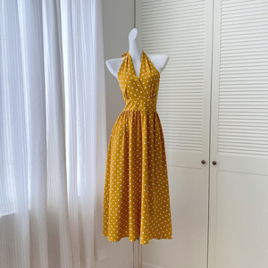 実写スポット香港風首波点ワンピース女性レトロ気質袖なしウエスト痩せロングスカート