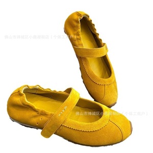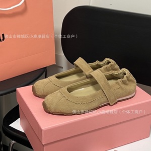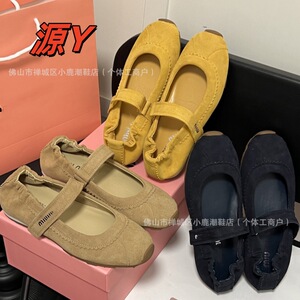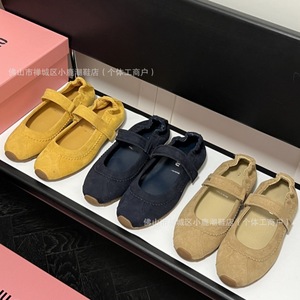 miu2025早春新款时髦魔术贴松紧玛丽珍单鞋真皮平底舒适芭蕾舞鞋