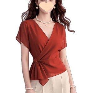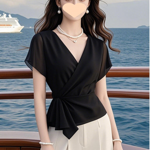 妖精のような絶妙で美しいシャツ、女性用のブルーウエスト半袖シャツ、夏のユニークで美しいシフォントップ