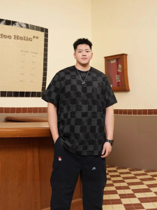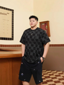 潮牌大码男装复古棋盘格夏季短袖t恤宽松加肥加大胖子半袖上衣服