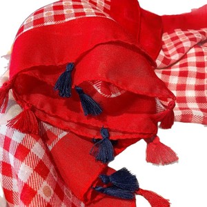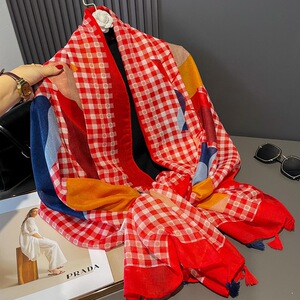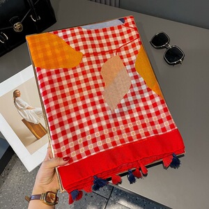 スカーフ薄い外国貿易クロスボーダー輸出シルクスカーフ春と夏の赤いエスニックスタイルの幾何学的なチェック柄バーリーシェードタッセルショール