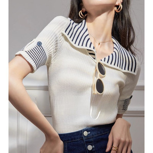 夏用の薄い半袖セーター、アイスシルクの白いストライプ、軽くて豪華なニッチなストリートスタイルの女性用トップス