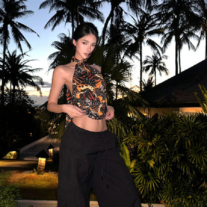 上着のギャルのサスペンダーのベストの女性の修身のリボンは首の短い金の蝶の復古の露背の春夏の項のプリントのバンドを掛けます。