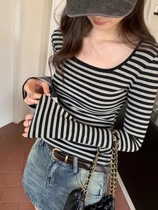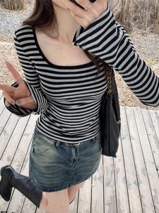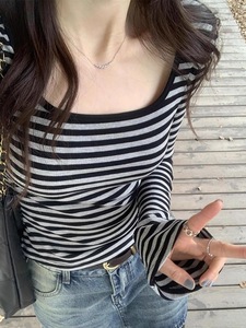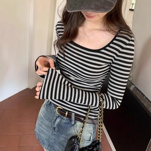 2025春秋新款韩版打底衫方领条纹气质百搭设计感长袖T恤女上衣服