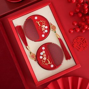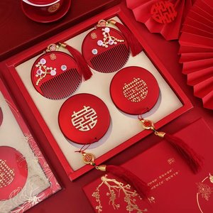 結婚式のハッピーワード小さな丸い鏡赤い女性の持参金用品ハイエンドミニコーム化粧鏡ペアの花嫁の持参金