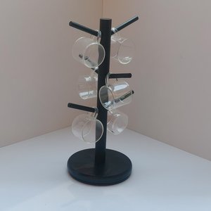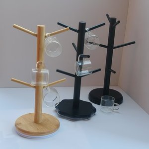 竹製6ポジションカップホルダー、ベース付き、多機能回転収納ラック、玄関ホールキーハンギングジュエリーマグホルダー