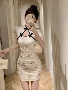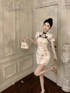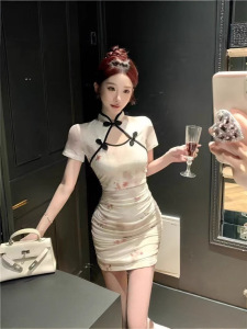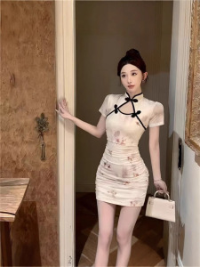 中国風のチャイナドレスは、若い女の子向けに改良された、レトロなショートウエストとヒップカバー、新しい中国風のドレス、女性の夏のスタイルです。