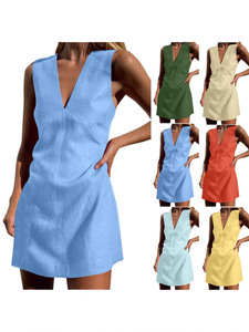 2024 ヨーロッパとアメリカンスタイルの V ネックコットンリネンノースリーブドレス女性の夏のベーシックソリッドカラースリムベストショートドレス