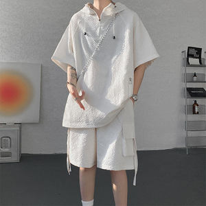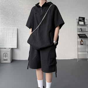 帽子付きカジュアルスーツ男性半袖半ズボン2点セット夏潮牌半ファスナーtシャツ大サイズ工装半ズボン