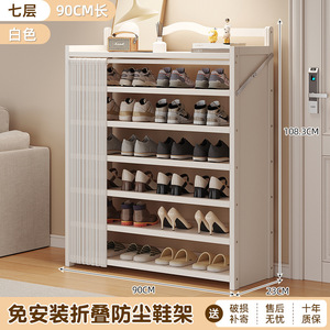 50ロング7段折りたたみ【ホワイト】収納シューズラック【ムーンホワイトガーゼカーテン】