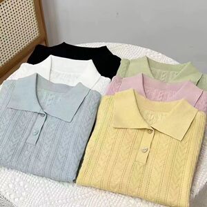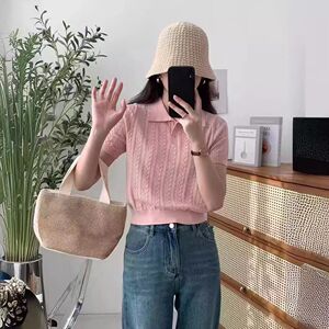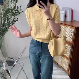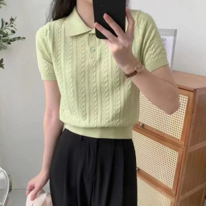 ショートポロカラーフレンチアイスシルクニットTシャツレディース2025夏新作中空ツイストトップ多用途T