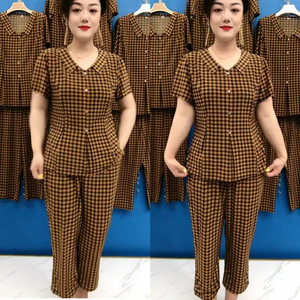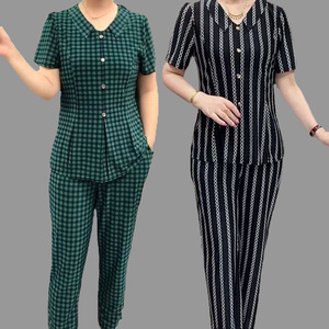 夏の新しい女性のチェック柄アイスシルク薄手スーツ 2025 ファッション年齢軽減クールママスーツ 2 点セット