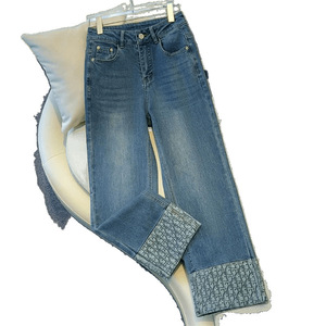 H1J ブルー ナインポイントデニムストレートパンツ レディース 2025春秋新作 フリッププリント スリムフィット 細見え