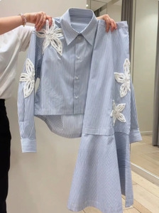 2025 夏の新ファッションフレンチブルーと白のストライプ五弁花中空ポロカラーシャツスカートスーツ
