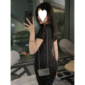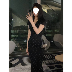 ヨーロッパの軽い高級感と重厚感のあるホットダイヤモンドVネックウエストカバーヒップスリム半袖ロングドレスレディース夏
