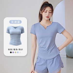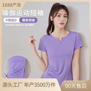 スポーツ半袖トップ夏 V ネック女性の速乾性ソリッドカラーウエストルーズ Tシャツランニングフィットネス痩身ヨガウェア