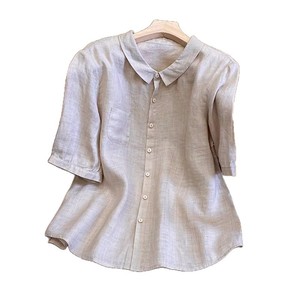 襟付き綿麻半袖シャツレディース2025夏の薄手のゆるい純色気質レトロカジュアル大サイズ上着