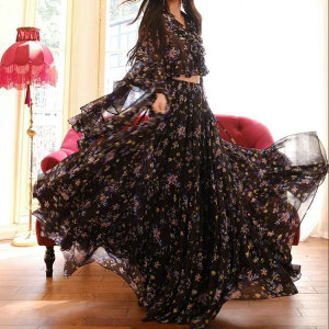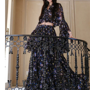 25夏の新しい黒い花の上着の半身のスカートの2つのセット