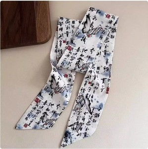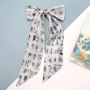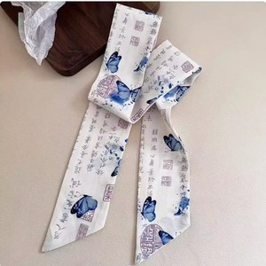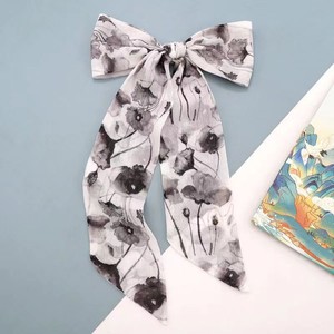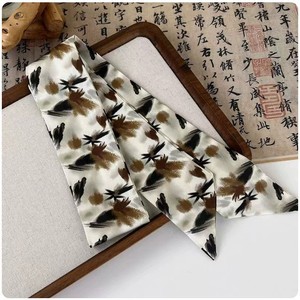 プリント蘭亭シルクスカーフ、水墨風、優しいヘアリボン、蝶結びヘアバンド、ロングシルクスカーフ