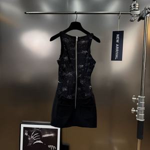 柚子mm2025年夏フランス風復古風角襟袖なし金属ボタン飾りキラキラ腰ワンピース