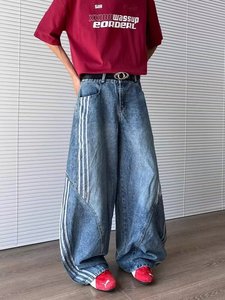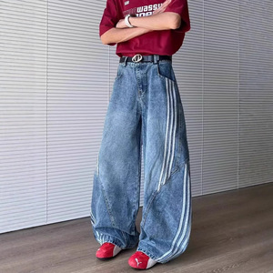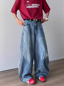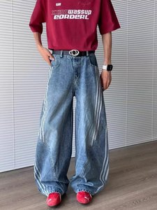 アメリカのレトロな三条の棒はカーブの刀のジーパンの男性の春秋の金を構成してデザイン感の鎌の広い足の長いズボンをつなぎ合わせます。