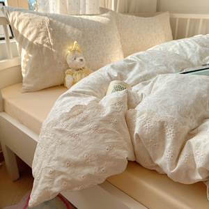 クラスAフレンチベッド4点セット、しわ加工糸、純綿、小花レース、学生寮用ボックスシーツ3点セット