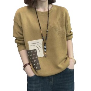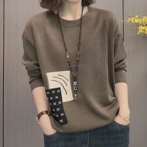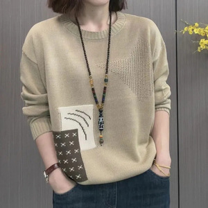 レディーストップス初秋の新ファッションラウンドネックエスニックスタイルウールセーターカジュアルルーズコントラストカラー多用途長袖