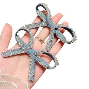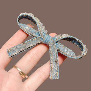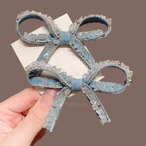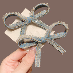 韓国デニム生地クリスタルリボンヘアピン 2025 新しい絶妙なレトロインターネット有名人サイドクリップワンラインクリップ