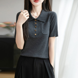25 夏の新アイスシルクポロカラーセーター半袖 Tシャツ女性の無地プルオーバーボトリングシャツトップ