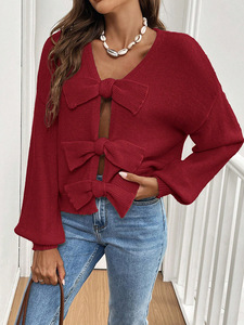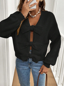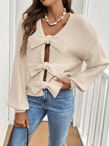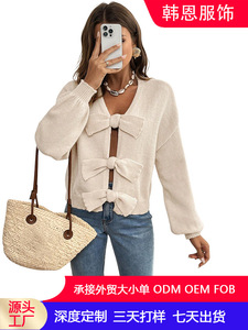 秋冬無地レディースカーディガンセーター、2025ヨーロッパとアメリカのシンプルなリボンとニッチなニットジャケット