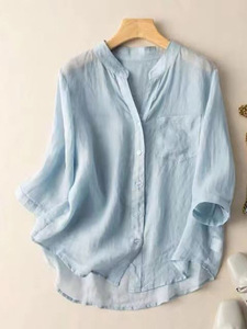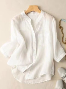 文学レトロ半袖シャツ綿とリネン 2025 夏の新 V ネックデザインカジュアルスタイル 5 分袖トップ女性のための