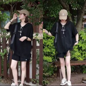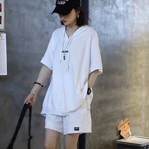 2025 新しい夏のスポーツとレジャースーツ女性のフード付き巾着ルーズ半袖 T シャツショーツ多用途文学スタイル
