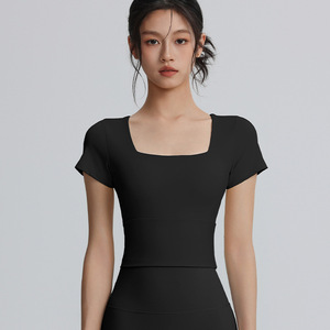 女性用固定カップスポーツトップス、伸縮性、タイトフィット、痩身、ショートヨガTシャツ、速乾性、通気性、ランニングフィットネス半袖