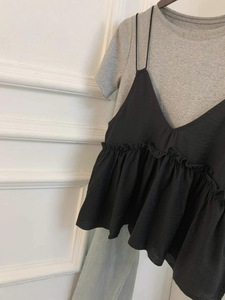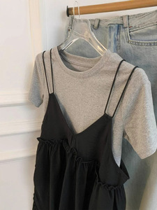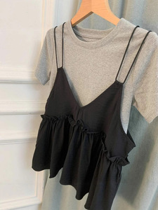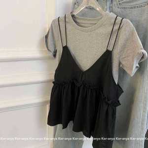 韓国風レイヤードサスペンダー半袖Tシャツレディースツーピース夏カジュアル西洋風甘いホットガールショートボトムシャツトップ