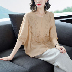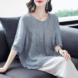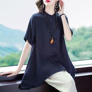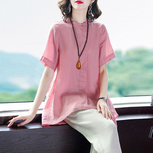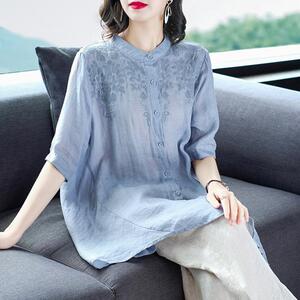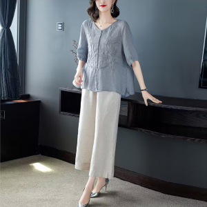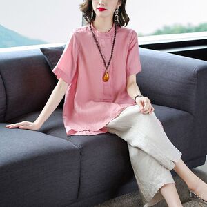 高級ラミースーツ、ワイドレディースエスニック風トップス、レディース夏のおしゃれなリネンワイドパンツ2点セット