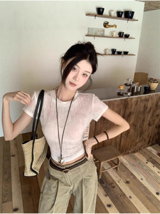 ホットガールウエスト微透けショートトップ半袖Tシャツレディース2025年夏新作右肩デザイン痩身トップ