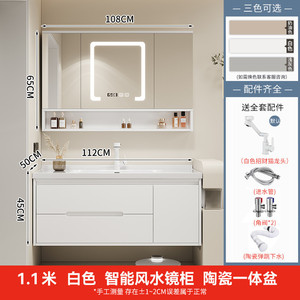 オーク材ドアパネルスマート風水ミラーキャビネット-ホワイト110CM +高品質セラミック+銅コアラッキーキャット蛇口