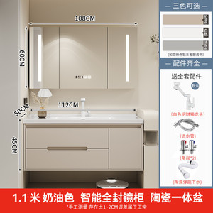 オーク材ドアパネル半密閉普通ミラーキャビネット-ミルクコーヒー色110CM +高品質セラミック+銅コアラッキーキャット蛇口