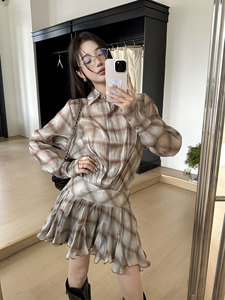 チェック柄ドレスレディースデザインニッチルーズラペル耳長袖ショートカジュアルプリーツスカートシャツドレス