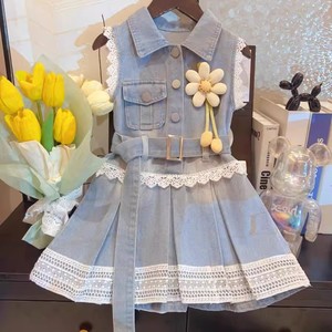 2025 新しい夏の女の赤ちゃんハイエンドプリントソフトデニムスプライシングスカートレースドレスノースリーブデニムスカート