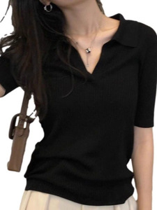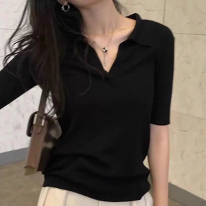 黒の右肩ポロカラー半袖Tシャツレディース夏の新しいデザインニッチハイエンド香港スタイルシックなトップ