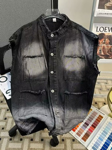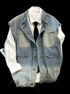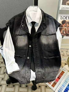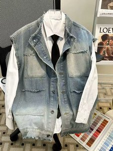 アメリカンウォッシュデニムベストメンズ夏のトレンディなブランドルーズカジュアル多用途ハンサムダメージ加工ノースリーブベストジャケット
