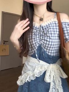フォレストスタイルのレトロで甘いデザインのデニムステッチフェイクツーピースドレス女性の夏の新しい気質痩身ロングスカート