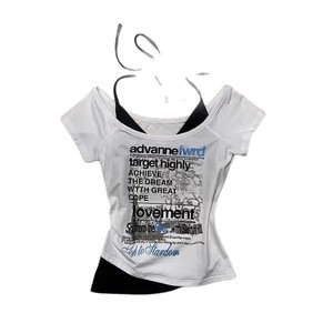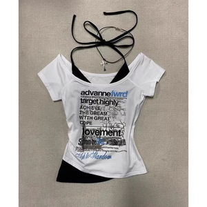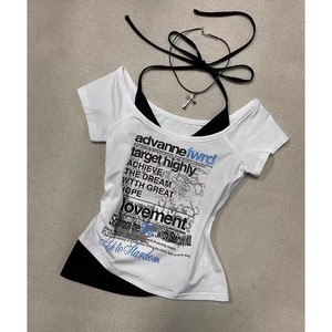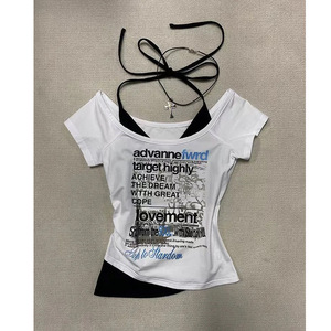 スイートガールホルターネック半袖Tシャツ女性用2025夏新デザイン偽ツーピースショートニッチスリムトップ