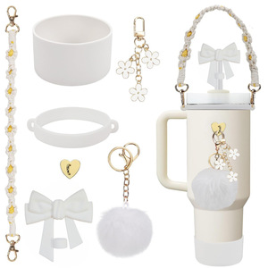 クロスボーダースタンレーカップフラワー装飾ストローキャップシリコンカップカバー小さな花ファーボールカップキーペンダントハンドロープ