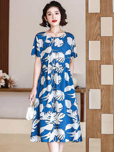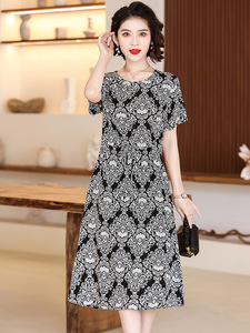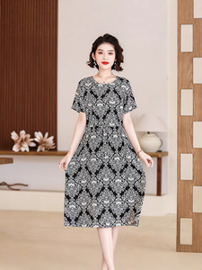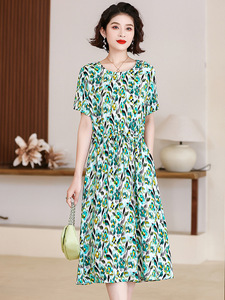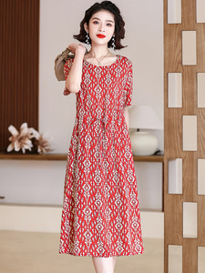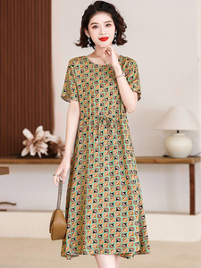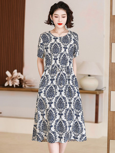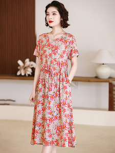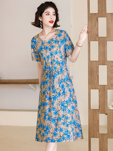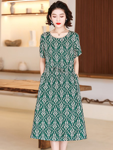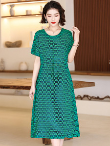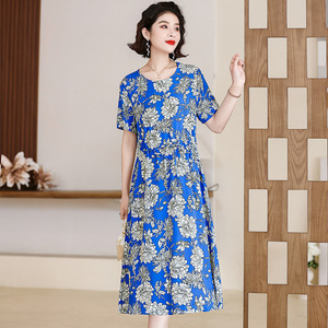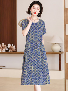 高端中老年上海纯棉绸连衣裙夏季新款外穿气质妈妈装人造棉碎花裙