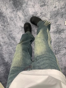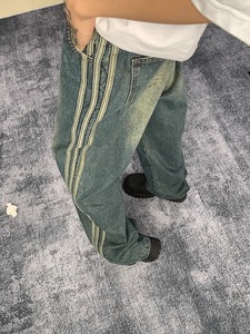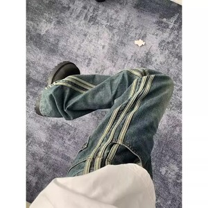三条杠织带水洗复古牛仔裤男款直筒宽松阔腿美式高街裤子潮牌痞帅