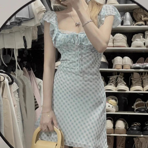 小柄な夏のブルーチェック柄の甘くてスパイシーなドレス女性の新しいウエストレーススカート