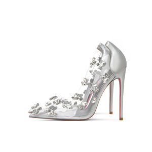 シルバー透明ラインストーンビッグドリルシングルシューズ女性夏宴会フラットハイヒールセット足の結婚式の靴韓国
