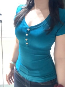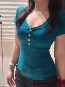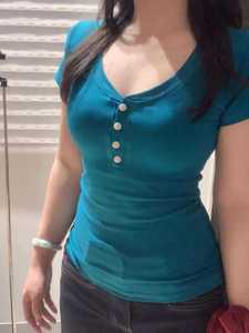 纯欲辣妹大领口修身v领短袖t恤女夏季独特漂亮掐腰孔雀蓝显白上衣